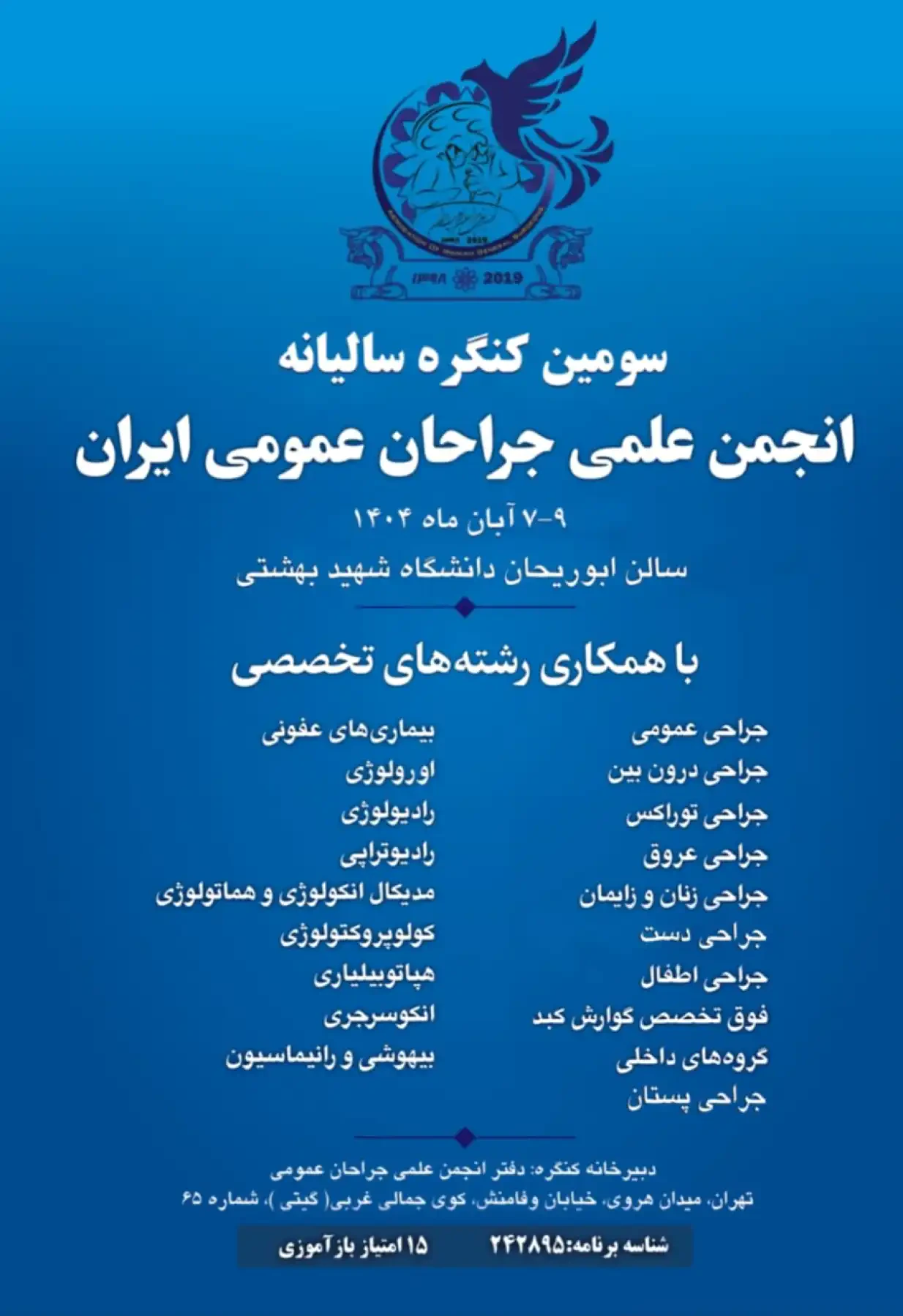 پوستر سومین کنگره سالیانه انجمن علمی جراحان عمومی ایران - ۷ تا ۹ آبان ۱۴۰۴